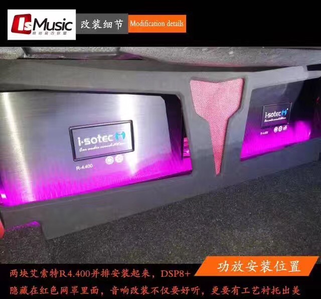 德国艾索特R4.400四路功放的助推,让喇叭音质得到尽情发挥,使原车音响播出悠扬而细腻的乐韵。将两台功放并排装在尾箱壁上,加以灯光点缀,时尚感立马彰显。音响改装作为一门艺术,不仅要好听,更要有精美的工艺。